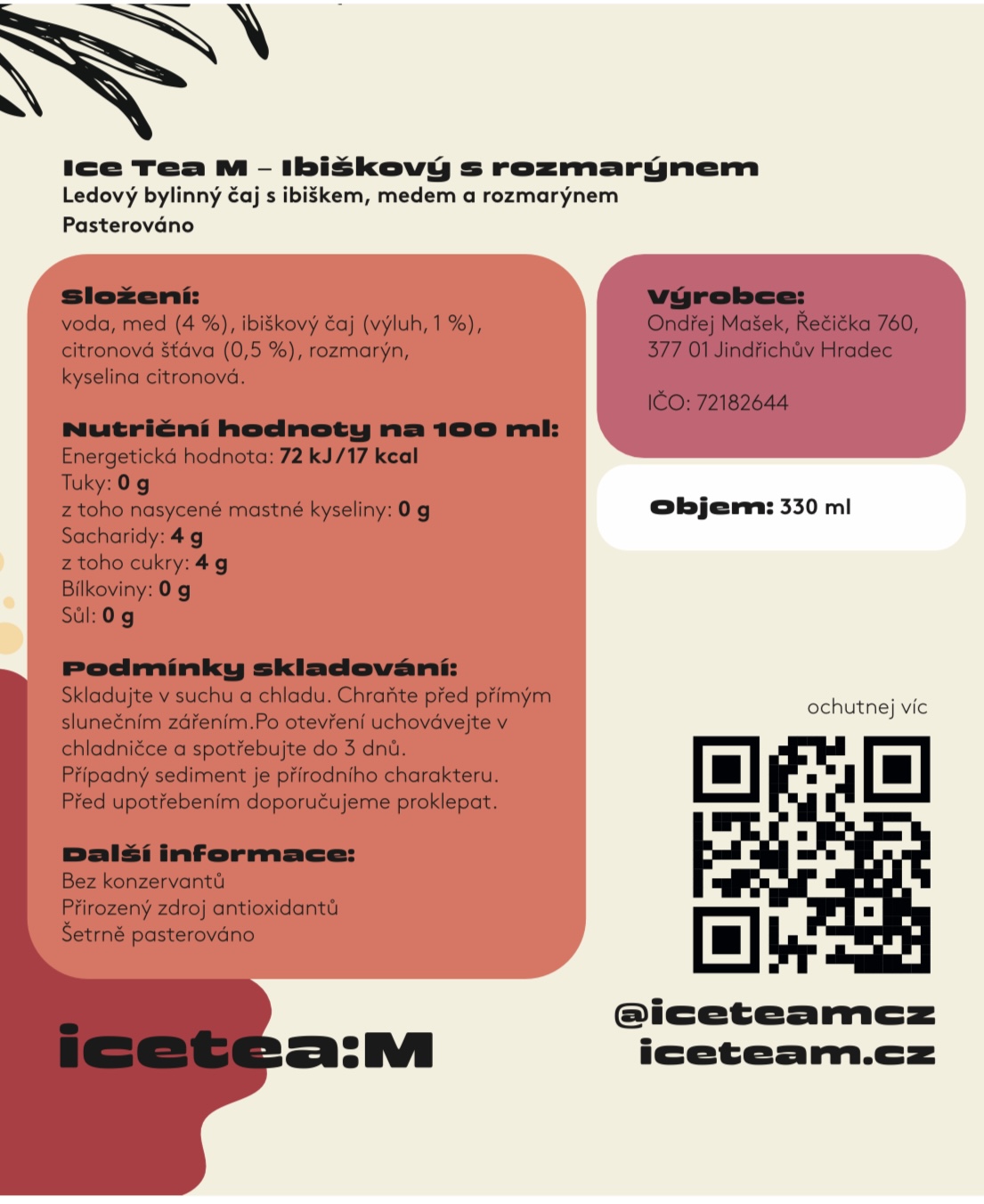 Lahodná a velmi osvěžující chuť ibišku, kterou jsme zjemnili medem z lokálních zdrojů a kapkou citronové štávy s velmi příjemnou vůní rozmarýnu. Když chceš relaxovat a ledově se osvěžit.
